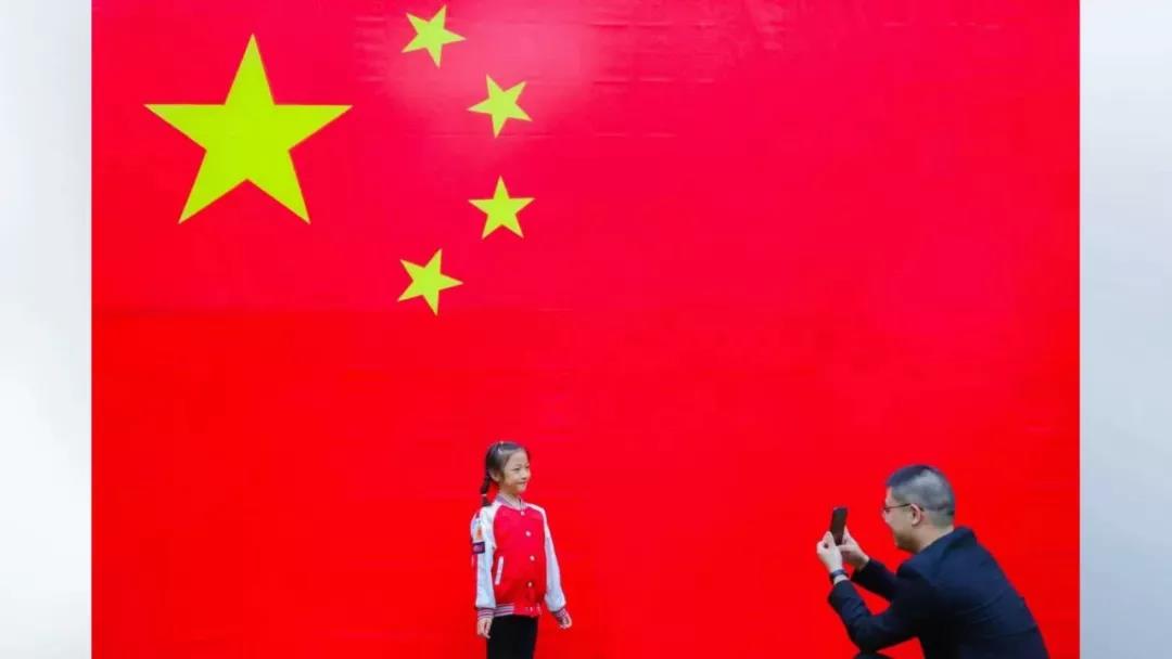 在水繪園風景區(qū),他們看到了一幅巨大的五星紅旗。周啟明拿出手機,拍下自己和女兒與國旗合影的畫面,讓孩子接受愛國主義教育。這時,正好碰上了攝影師徐慧,拍下了這幅幸福溫馨的照片。
