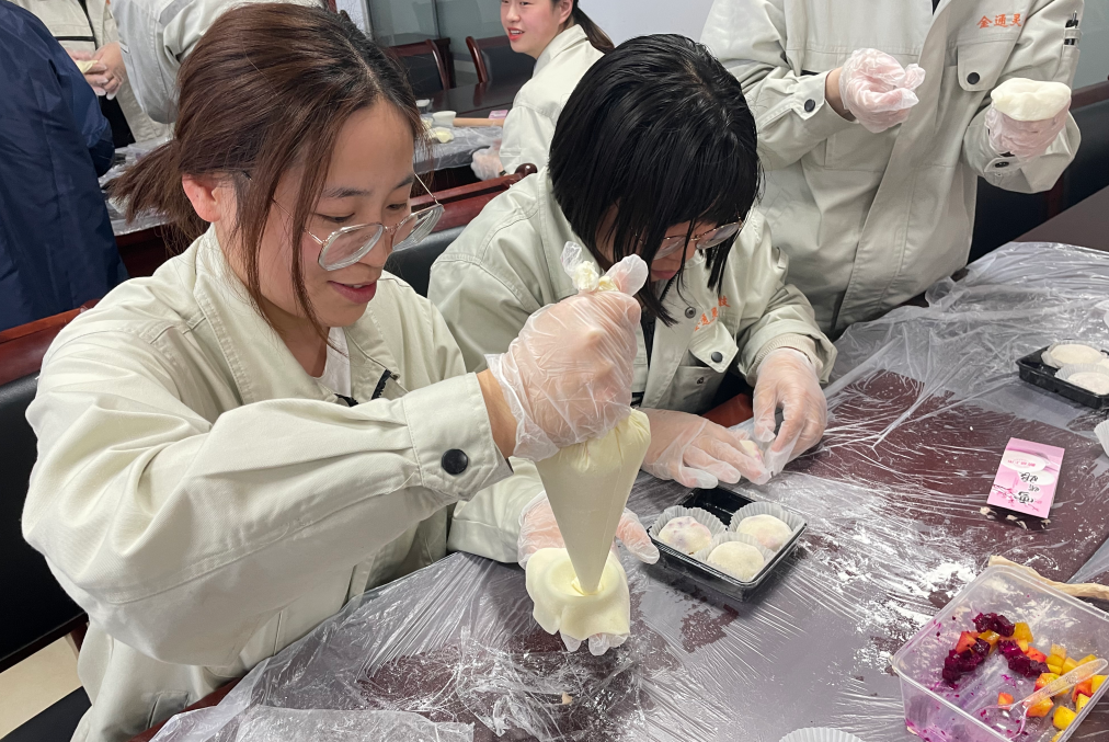 當天下午,金通靈近100名女職工歡聚813活動室,在張老師的現(xiàn)場制作教導下,分別制作了雪媚娘和便當?shù)案狻;顒蝇F(xiàn)場,張老師講解了烘焙知識和制作流程,職工們在認真聆聽后,體驗著自己動手制作甜品的樂趣,享受著快樂的烘焙時光。隨著時間的推移,一個又一個飽滿、垂涎欲滴的雪媚娘、一個個精致的便當?shù)案庵谱魍瓿伞?